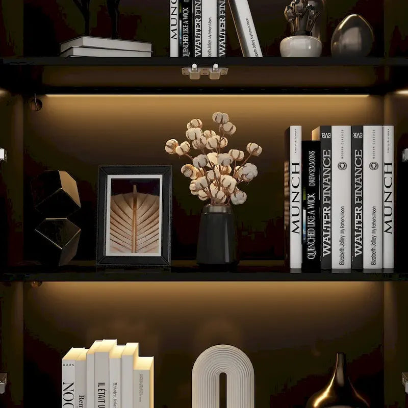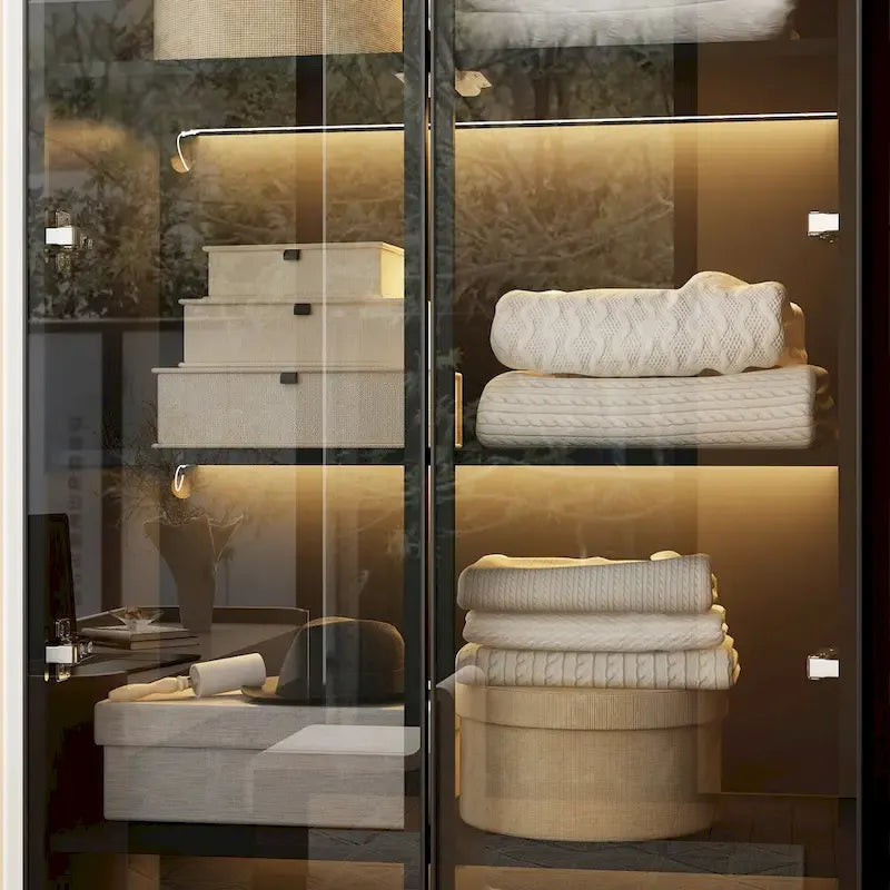 Black Glass Door Wardrobe Set with Lighting Strips, Storage Cabinet