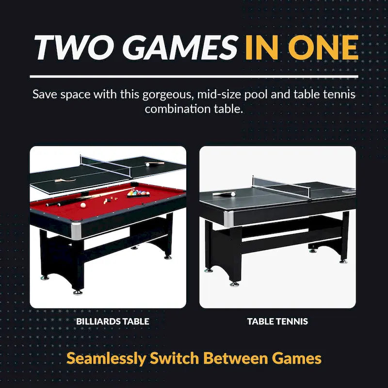 - DOUBLE THE FUN Save space with this gorgeous, mid-size pool and table tennis combination table. Its lightweight tennis table top easily installs over the table frame, keeping the fun rolling at a crisp, competitive pace.