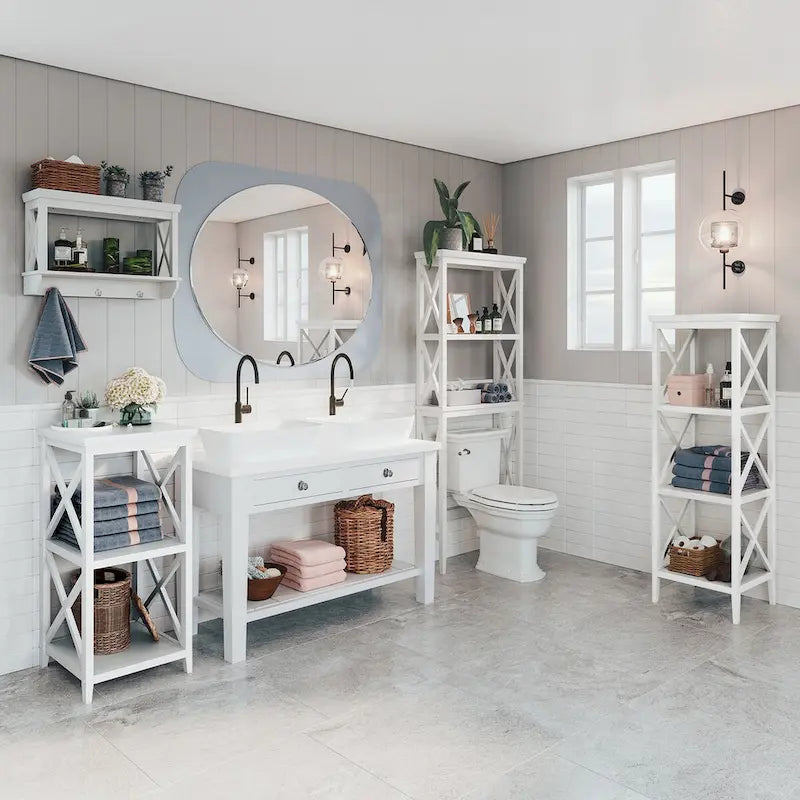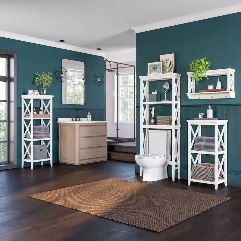 Functionality meets style in this stylish, contemporary shelving unit. Perfect for toiletries, towels and decorative accents, this cross-frame storage tower includes three open shelves and a top shelf for maximizing storage and display space. Use in the bathroom for extra towels and decorative baskets, or in the living room or office to organize books, photo albums and more. Includes instructions for easy assembly and secures to the wall with an adjustable anchor bracket for added stability. Pair with the additional items in the RiverRidge Home La Crosse Collection to give your space an organizational makeover.