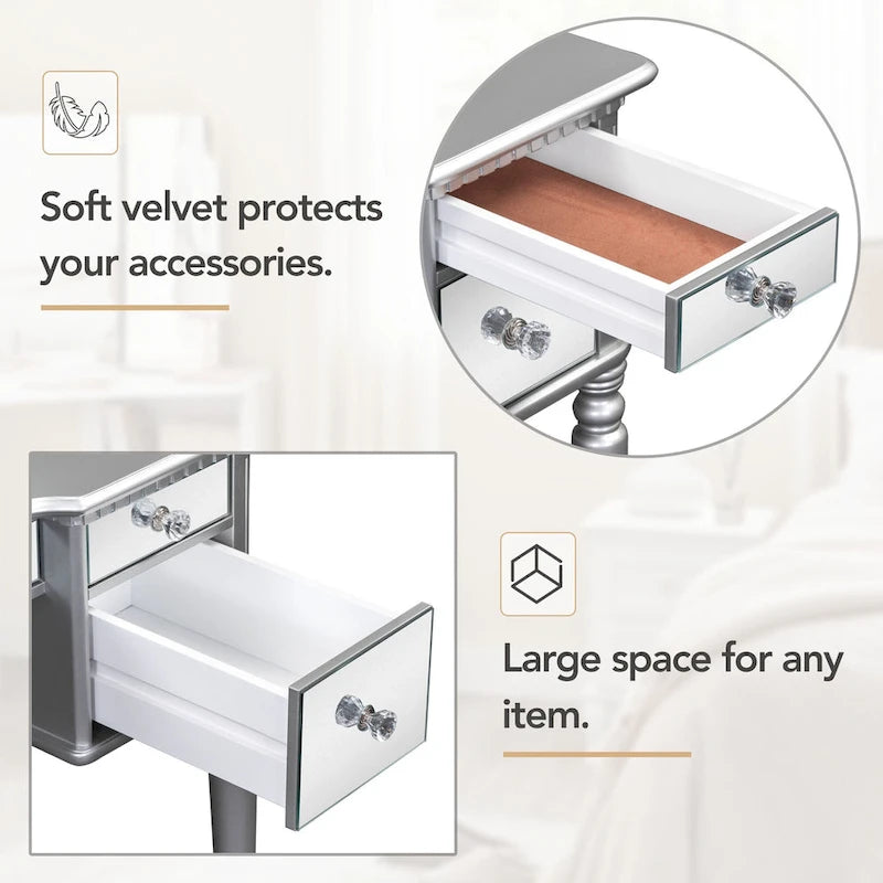 Plush Upholstered Stool: The set comes with a luxuriously cushioned stool, offering both style and comfort for your beauty routine.