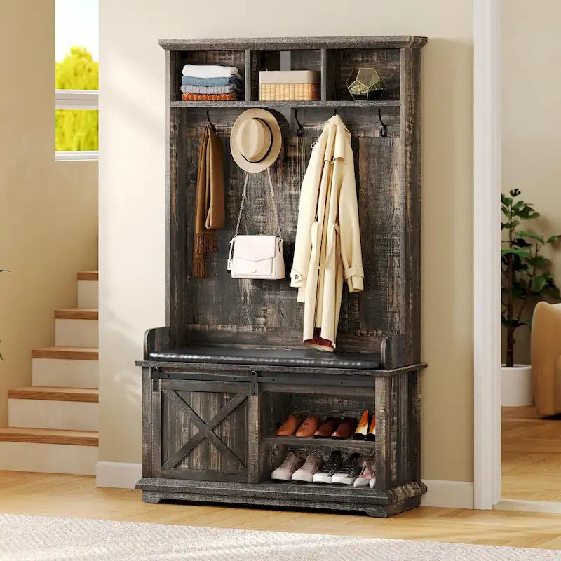 Presenting our 3-in-1 Hall Tree with Bench, an efficient entryway organizer that combines coat racks, shoe storage, and additional storage shelves. With a movable padded cushion for comfort and a rustic sliding barn door for style, it's perfect for any entryway, hallway, or living room. Crafted for durability, it offers ample storage and a secure, sturdy construction.