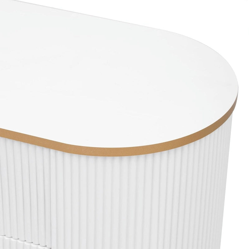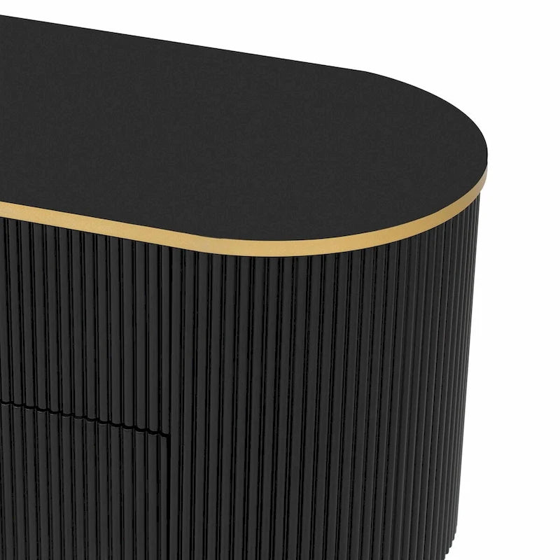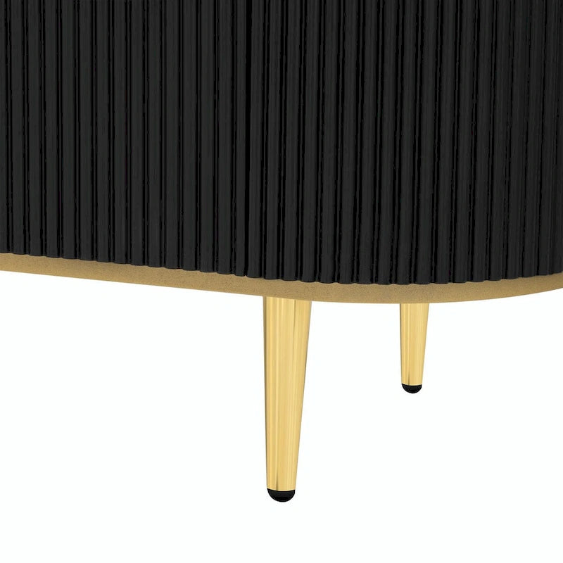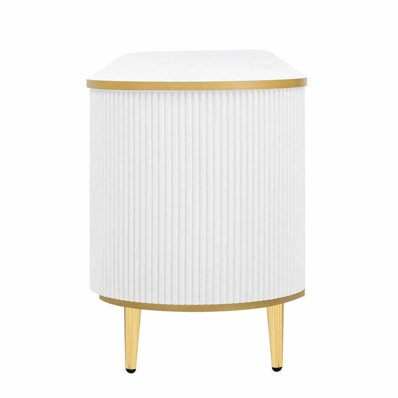 Transform your living space with this elegant and practical curved TV stand, designed with vertical grooves on the overall body. The top and bottom panels are adorned with gold edges, complemented by five metal cone-shaped feet that provide both stability and style. Featuring four drawers and a storage compartment, this TV stand offers ample space for storing various items.