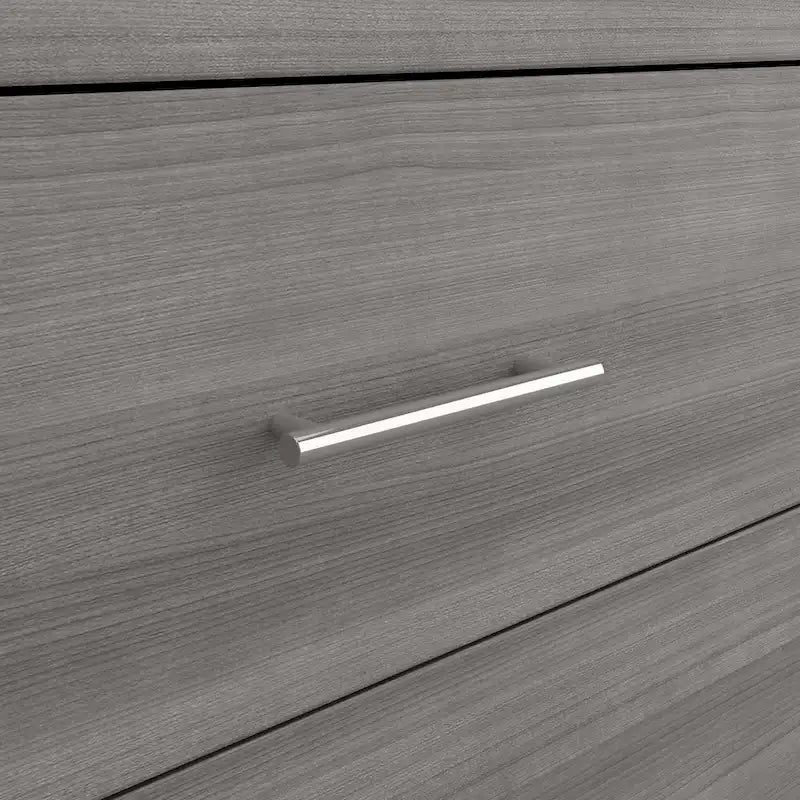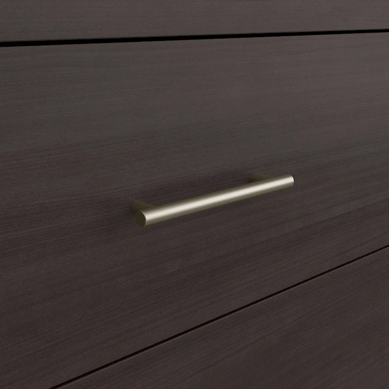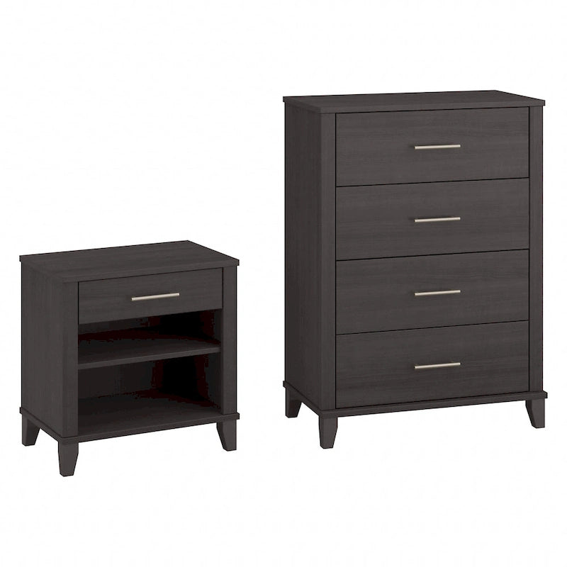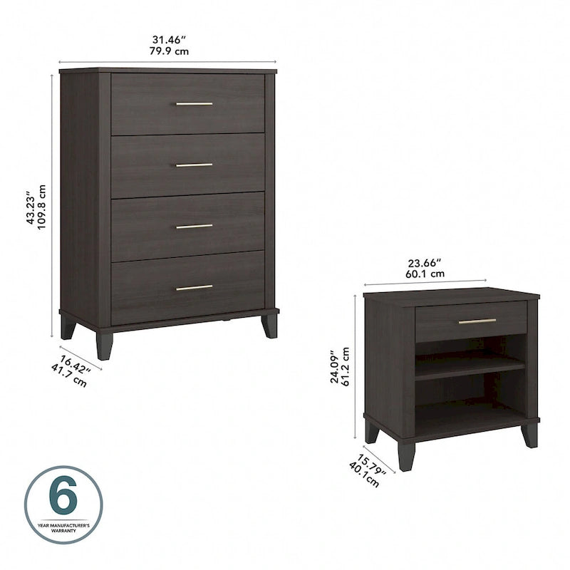 Create a relaxing atmosphere in your bedroom with the dependable yet soothing Bush Furniture Somerset Chest of Drawers and Nightstand Set. All four vertical dresser drawers have been rigorously tested with a 70 lb. weight to surpass industry standards for stability on both hard and carpeted flooring. The innovative Open-Safe mechanism takes stability a step further by preventing more than one drawer from pulling out at a time, and a wall anchor is included to provide even more security. The Chest's drawers also open on smooth ball bearing slides that stop when fully extended to keep them from being removed unintentionally. The Nightstand features one box drawer and two shelves to ensure that personal supplies and reading materials are never out of reach. The bottom shelf is fixed for stability, and the upper shelf can be adjusted to store items of various sizes. The bedside table's top surface easily supports a reading lamp, alarm clock and other essentials. Somerset's transitional styling includes tapered legs, contemporary metal hardware, and your choice of four elegant finishes: Ash Gray, Fresh Walnut, Platinum Gray and Storm Gray. This bedroom furniture set has been meticulously designed and tested with your safety in mind and is backed by a 6 Year Manufacturer's Warranty. See the collection for coordinating items available, including a Full/Queen Size Headboard, 6 Drawer Dresser, Armoire Cabinet, Credenza TV Stand and more.