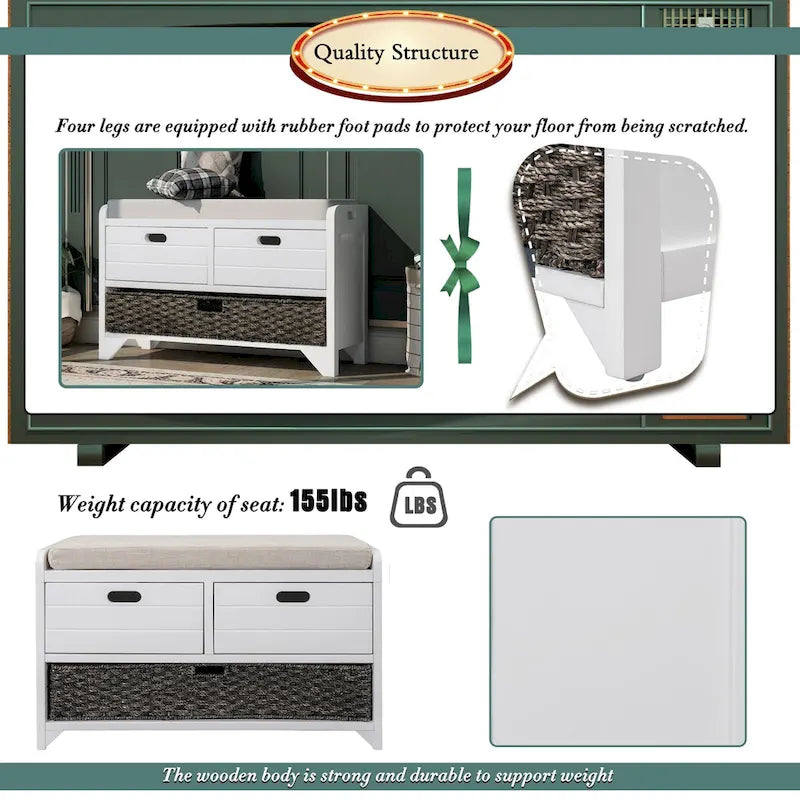 - Versatile Use:Place this rustic storage bench anywhere in your home with its highly versatile design that will compliment a variety of spaces. Enjoy the thick cushioned upper to take a breath or relax on the bench, the basket and 2 drawers make this piece the perfect contender for shoe storage in your hallway or an organizer in bedroom or living room.