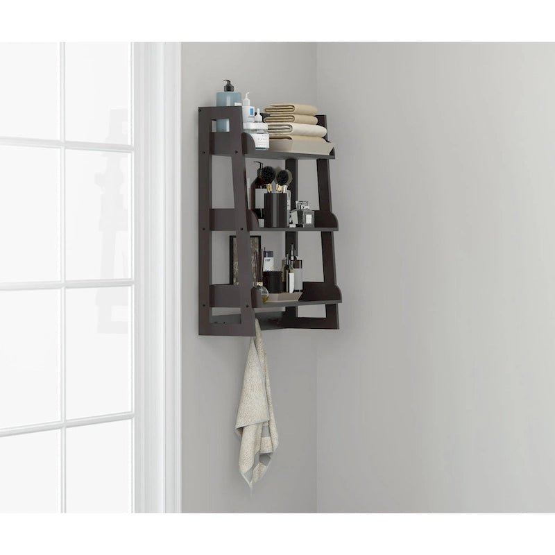 Organize your bathroom with the UTEX 3 Tier Bathroom Shelf Wall Mounted with Towel Hooks. Crafted from quality manufactured wood, this sturdy wall-mounted shelf ensures strength and durability. The elegant finish complements a variety of bathroom decor styles. With three fixed shelves and three easy-to-reach pegs, this shelf is perfect for storing and displaying towels, toiletries, and other essentials. The open shelving creates an illusion of space, making it ideal for smaller bathrooms. This shelf also helps reduce clutter and creates extra storage space. Available in white and espresso. Assembled dimensions: 19.5W x 8D x 26H.